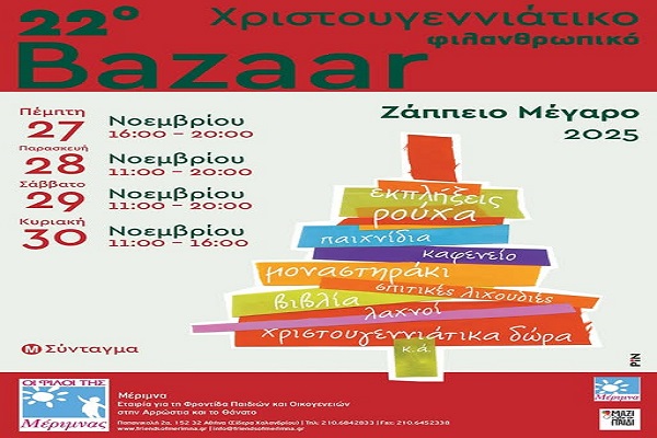 Σωματείο « ΟΙ ΦΙΛΟΙ ΤΗΣ ΜΕΡΙΜΝΑΣ » Χριστουγεννιάτικο Bazaar 27-30/11/2025